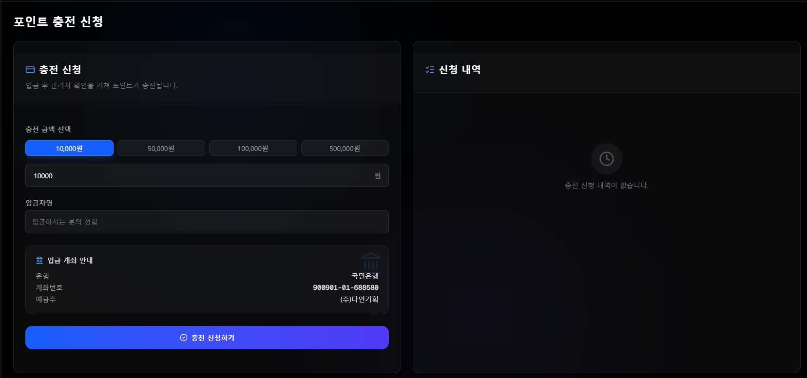 모든 서비스는 자동화된 포인트 결제 시스템으로 운영됩니다. 메뉴의 [포인트 관리 > 충전 신청]에서 원하는 금액을 입력 후 무통장 입금을 진행해 주세요.